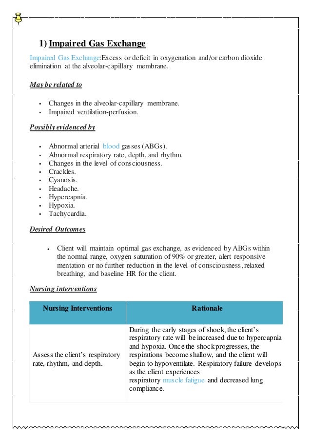 A caregiver should have goals to achieve for the due to the vast knowledge and expertise by our nursing careplan writers, nursing writing services offers the best impaired gas exchange care plan. Gas exchange physiology animation this animation video explains physiology of how oxygen and co2 are exchanged in the. Normal abgs, alert responsive mentation, and no further reduction in mental status. Impaired gas exchange r/t ventilationperfusion imbalance aeb abnormal arterial blood gases. Clinical indicators of impaired gas exchange in cardiac postoperative patients คณะพยาบาลศาสตร์ วชร.