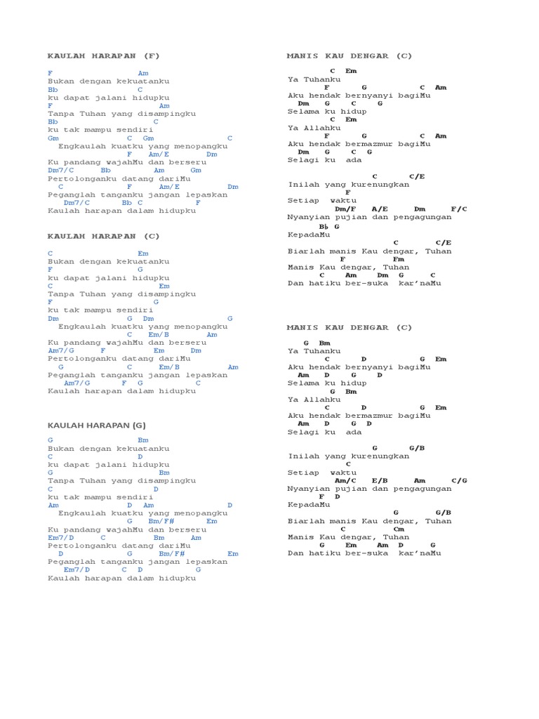 Chord Kaulah Harapan Sari Simorangkirb Bait b C Em Bukan Dengan Kekuatanku F G Ku Dapat Jalani Hidupku C Em Tanpa Tuhan Yang Di Sampingku F G Ku Tak Mampu Sendiri Dm G Engkaulah Kuatku Dm G Yang Menopangku Reff b C GB Am Kupandang Wajah-Mu Dan Berseru CG F CE G Pertolonganku Datang Dari-Mu C GB Am Peganglah Tanganku Jangan Lepaskan CG. Chord Kaulah Harapan Sari Simorangkir Bait. 12112017 Chord C Verse.