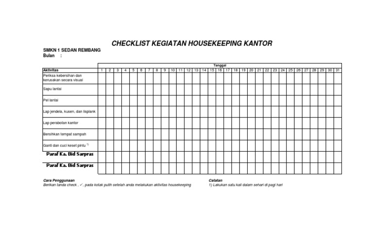 6030102 CHECKLIST KEGIATAN HOUSEKEEPING TOILET PUTRI Bulan. Umum mengecek kebersihan dan kerapihan ruang kerja sekali dalam sehari dengan mengisi huruf B yang berarti bersih dan K yang berarti Kotor pada Form Pemantauan Kondisi Ruang Kerja Petugas kebersihan lantai menyapu mengepel dan menempatkan tempat sampah peralatan dan bahan pembersih pada tempatnya paling lambat 15 menit sebelum jam kerja kantor dimulai. Aktifitas Kebersihan Diri Tangan Atribut Lengkap Kepanjangan Kuku Kebersihan dan Kelayakan Peralatan Kerja Kebersihan Packing Product Kebersihan dan Kelayakan Robot Kebersihan Rak Foam dan Meja Kebersihan Mesin Injection Kebersihan Lantai Kebersihan dan Kelayakan.