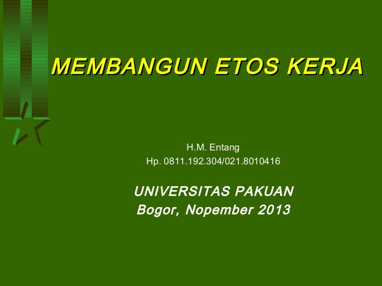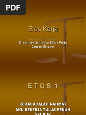 Etos kerja ppt. Etos kerja merupakan suatu konsep tentang kerja atau paradigma kerja yang diyakini seseorang atau juga kelompok ialah sebagai baik dan juga benar yang diwujudkan dengan melalui perilaku kerja mereka dengan secara khas. Tujuan dari sikap aktual ini adalah agar kita terbiasa bekerja keras dan selalu tuntas untuk mencapai mimpi dan keinginan kita tanpa merubah diri kita menjadi pecandu kerja. ETOS 4 KERJA ADALAH AKTUALISASI AKU BEKERJA KERAS PENUH SEMANGAT Aktualisasi adalah kekuatan yang kita pakai untuk mengubah potensi menjadi realisasi.