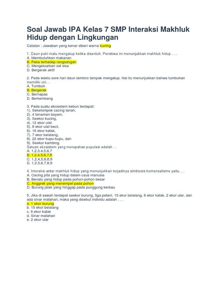 Soal Jawab Ipa Kelas 7 Smp Interaksi Makhluk Hidup Dengan Lingkungan
